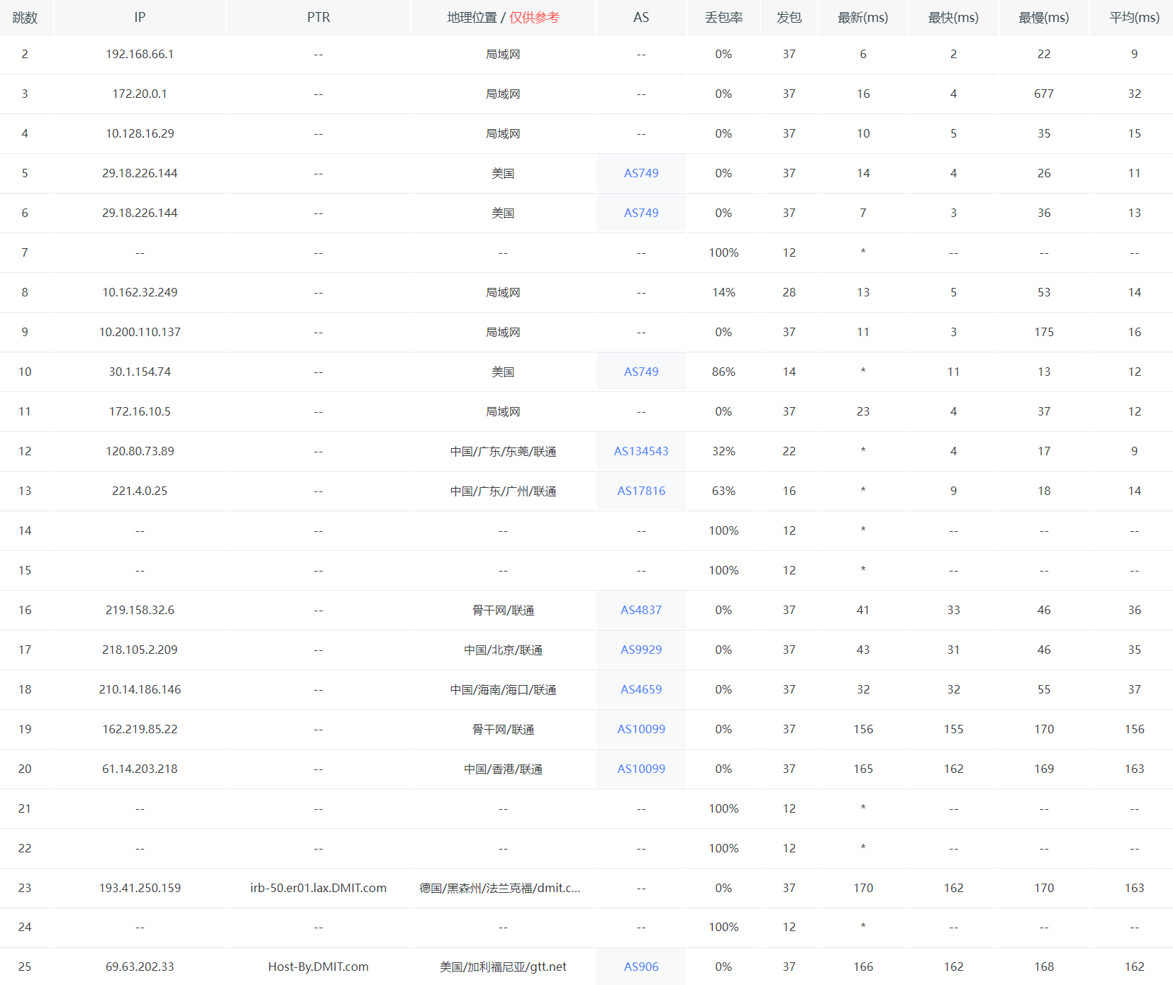 再看一下详细的不同线路的回程路由情况:
