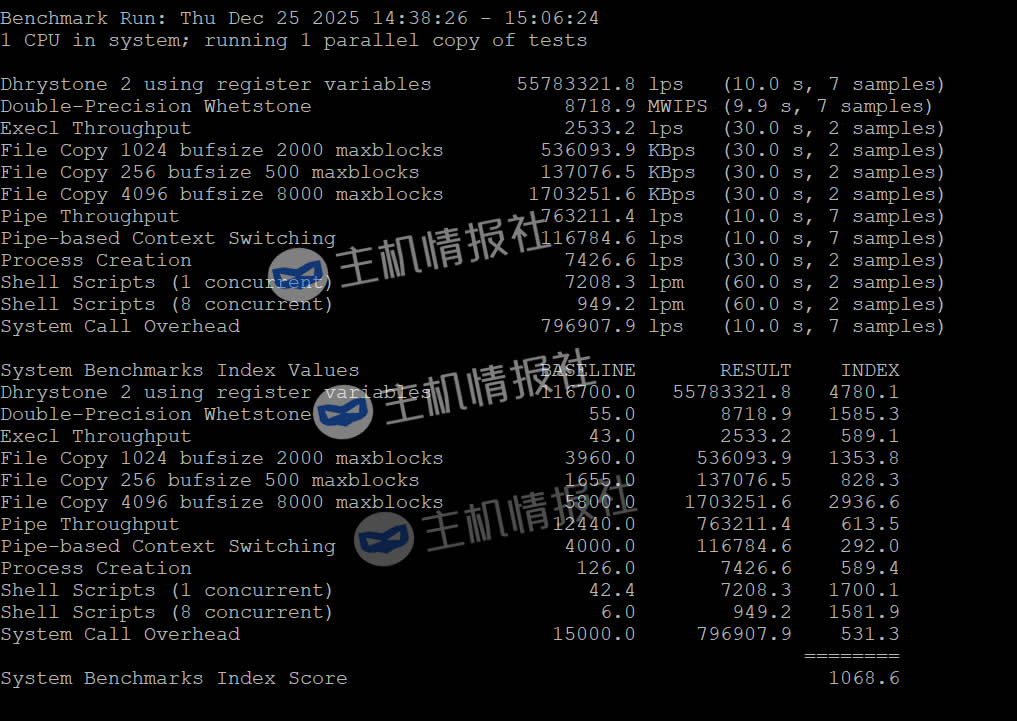UnixBench跑分,单核能上1000分都是很牛逼的了: