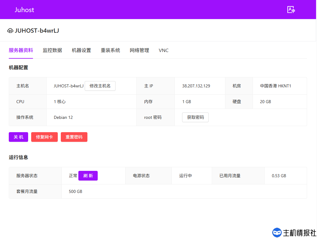Juhost的VPS管理界面相对较为简陋,支持关机、重置密码、重装系统、VNC,有资源监控,但无重启功能。