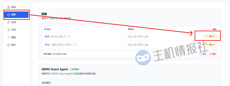 点击后台VPS面板中的网路 - 选择“更换IP”按钮:
