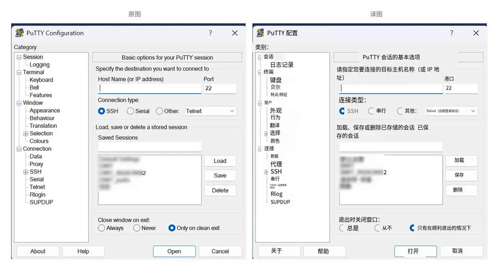 PUTTY也是社长常用的工具,下面是PUTTY的软件界面(左边是界面原图右边是软件翻译后的截图):