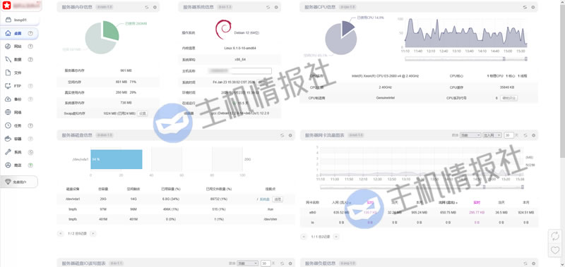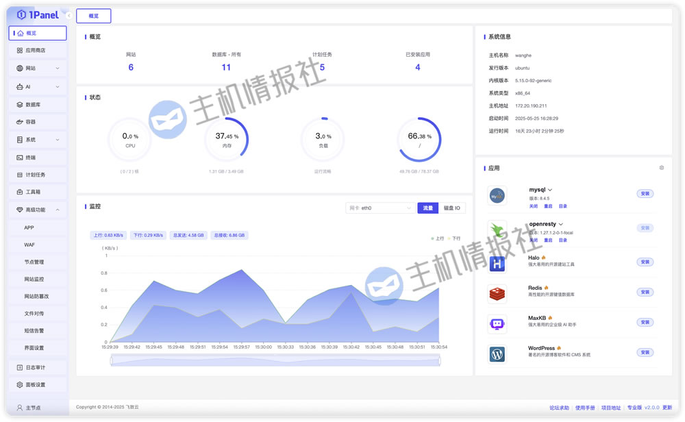 界面:1Panel是目前主机情报社最喜欢的一个界面,相当现代、科技感强,符合主流审美。而且没有宝塔面板那么多内置广告,界面较为清爽。