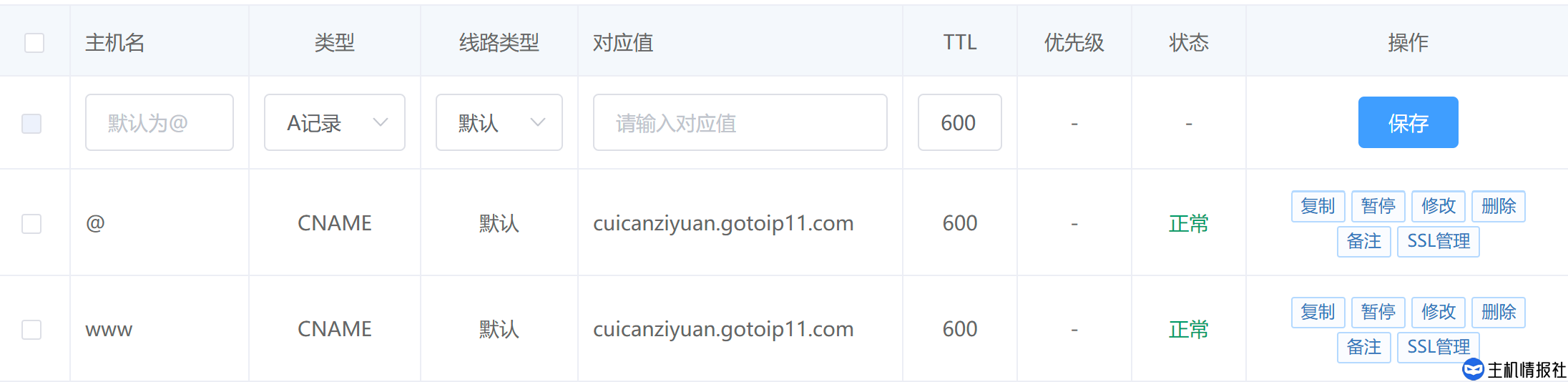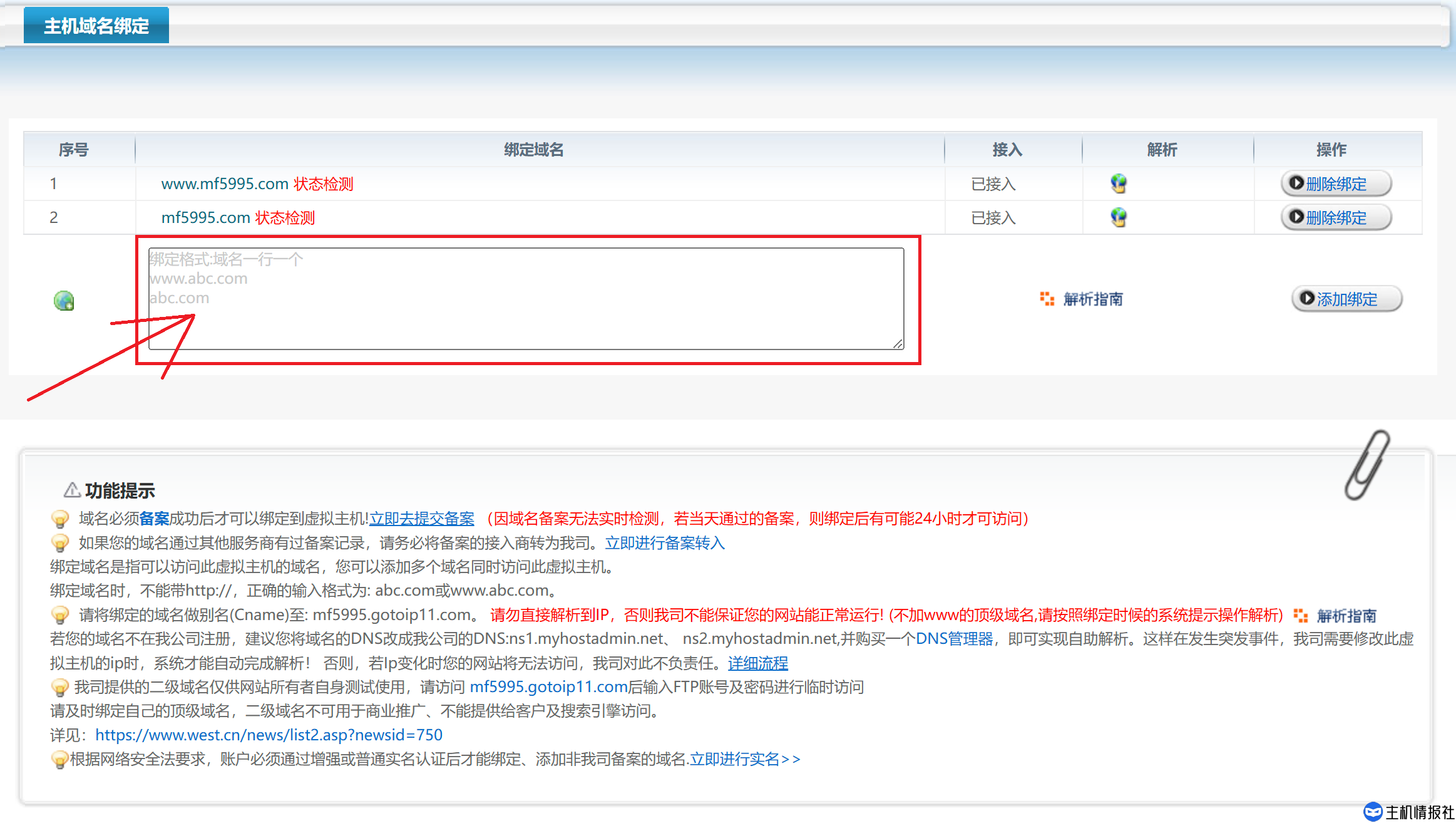 在主机名的位置,我们要将@和www都进行解析,类型选择CNAME,其他的无需你操作,点击解析即可。然后,我们点开虚机管理,找到你的虚拟主机,在主机域名绑定中,将你解析的两个域名填入方框,点击添加绑定即可。