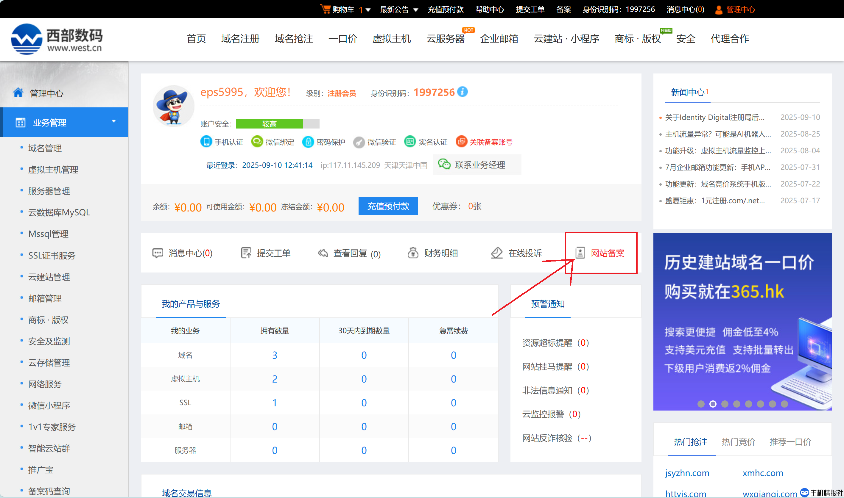 在我们管理中心的首页可以找到网站备案,在我们购买完大陆地区的虚拟主机和域名后,我们就可以点击网站备案来进行备案。
