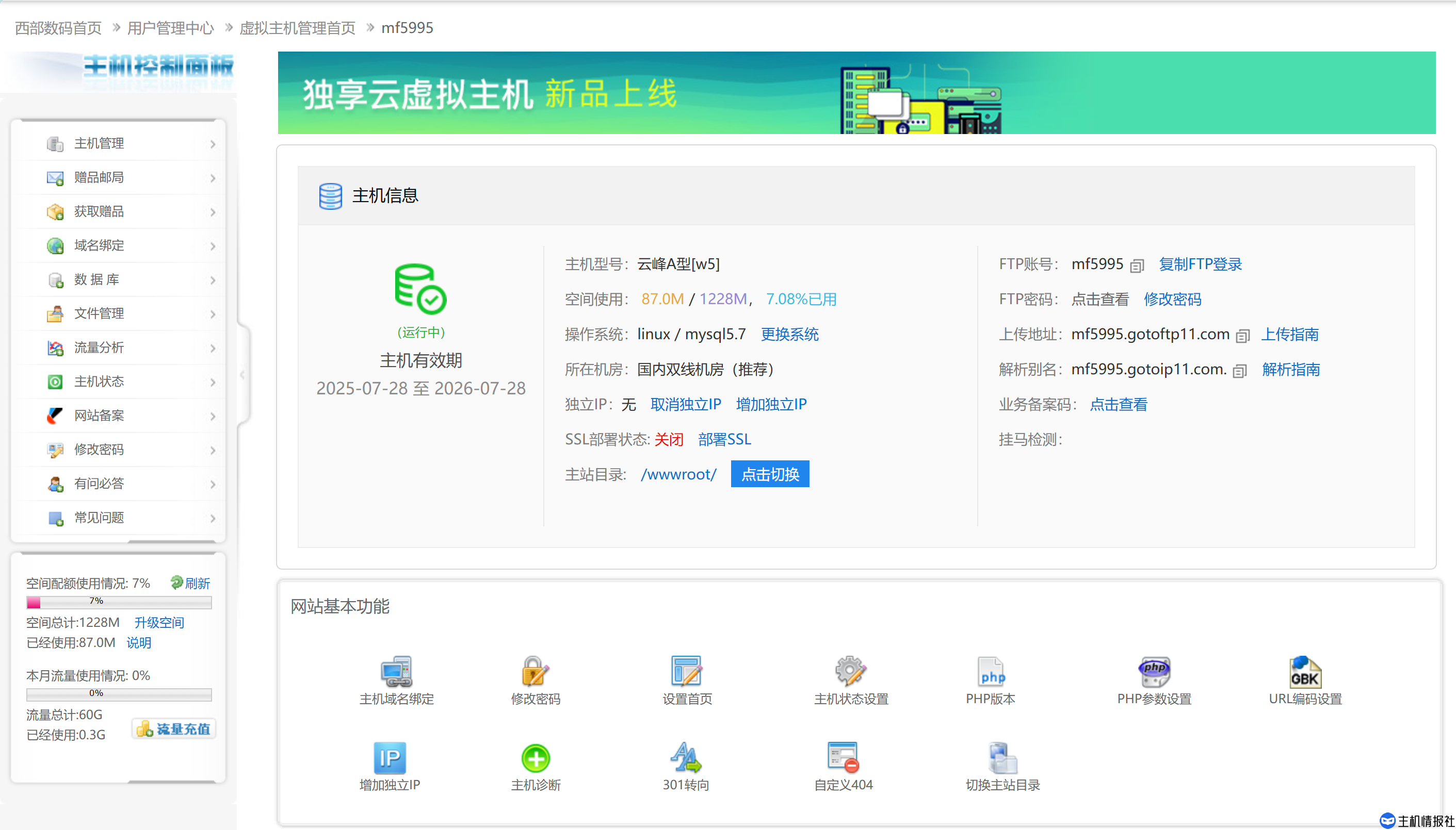 可以看到,虚拟主机的整个文件非常非常小,只有1个G大小,已经使用了87M,仅7%而已。